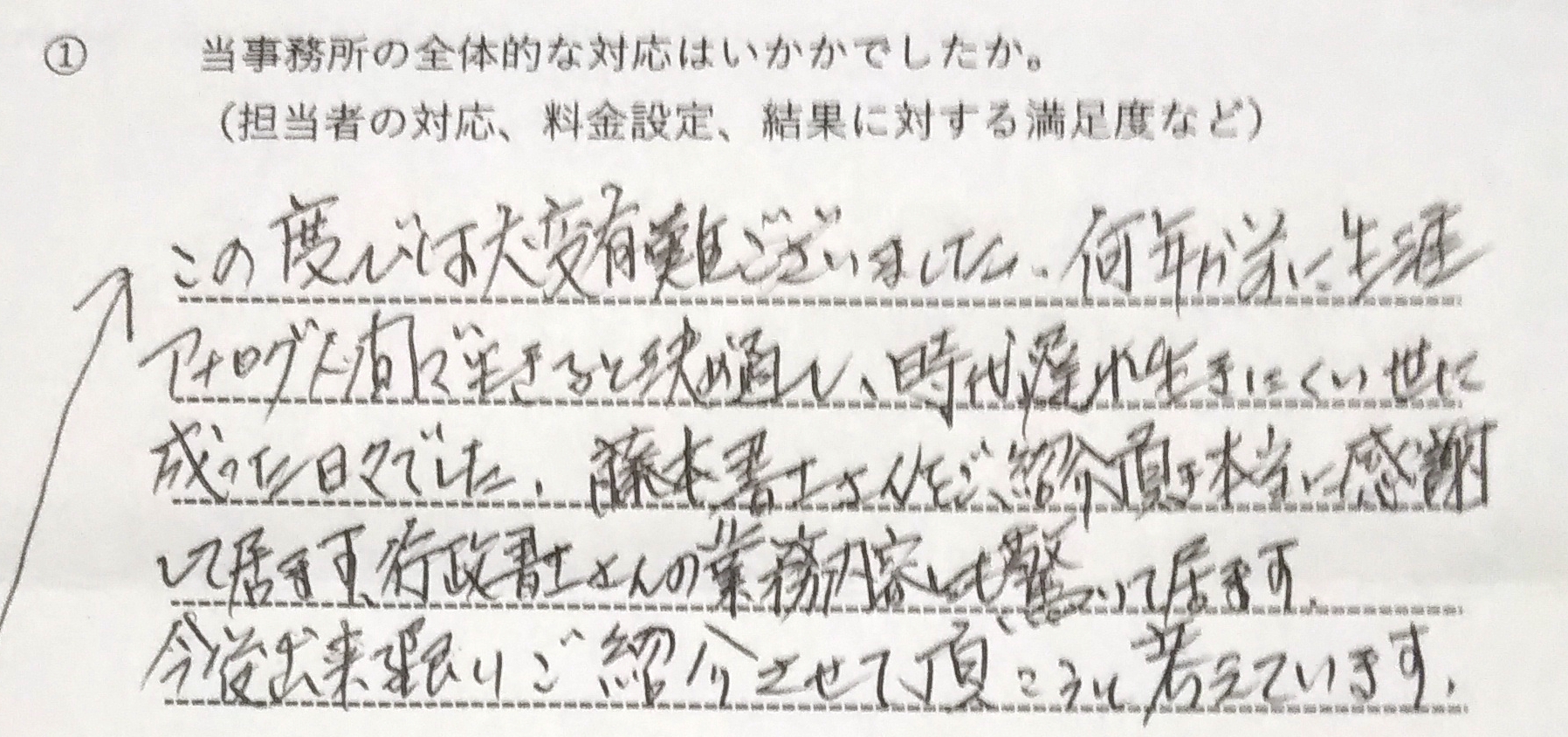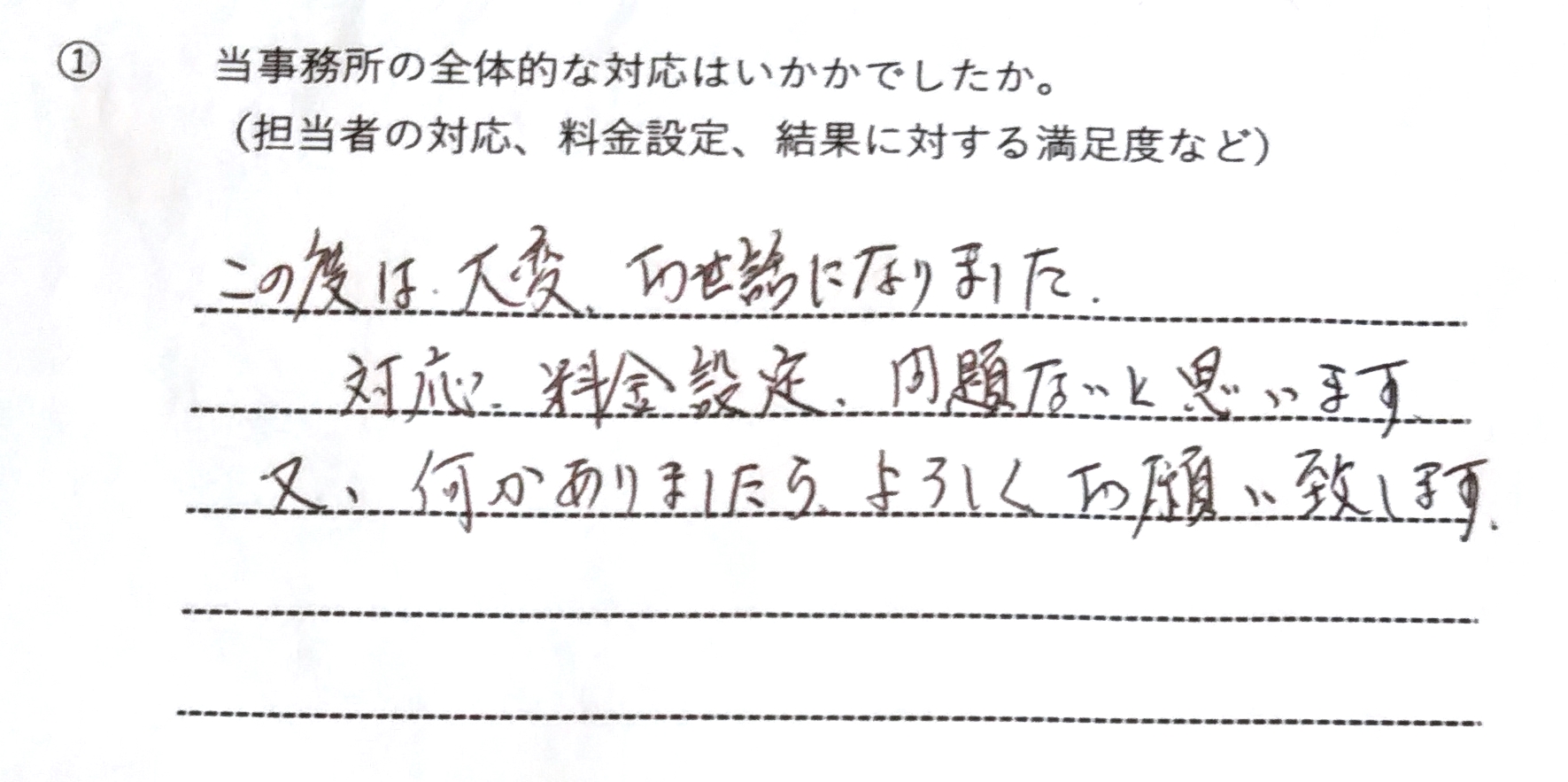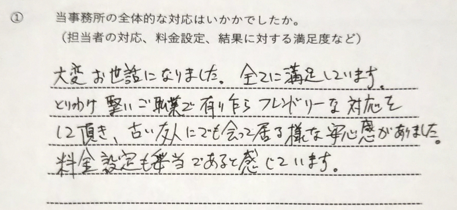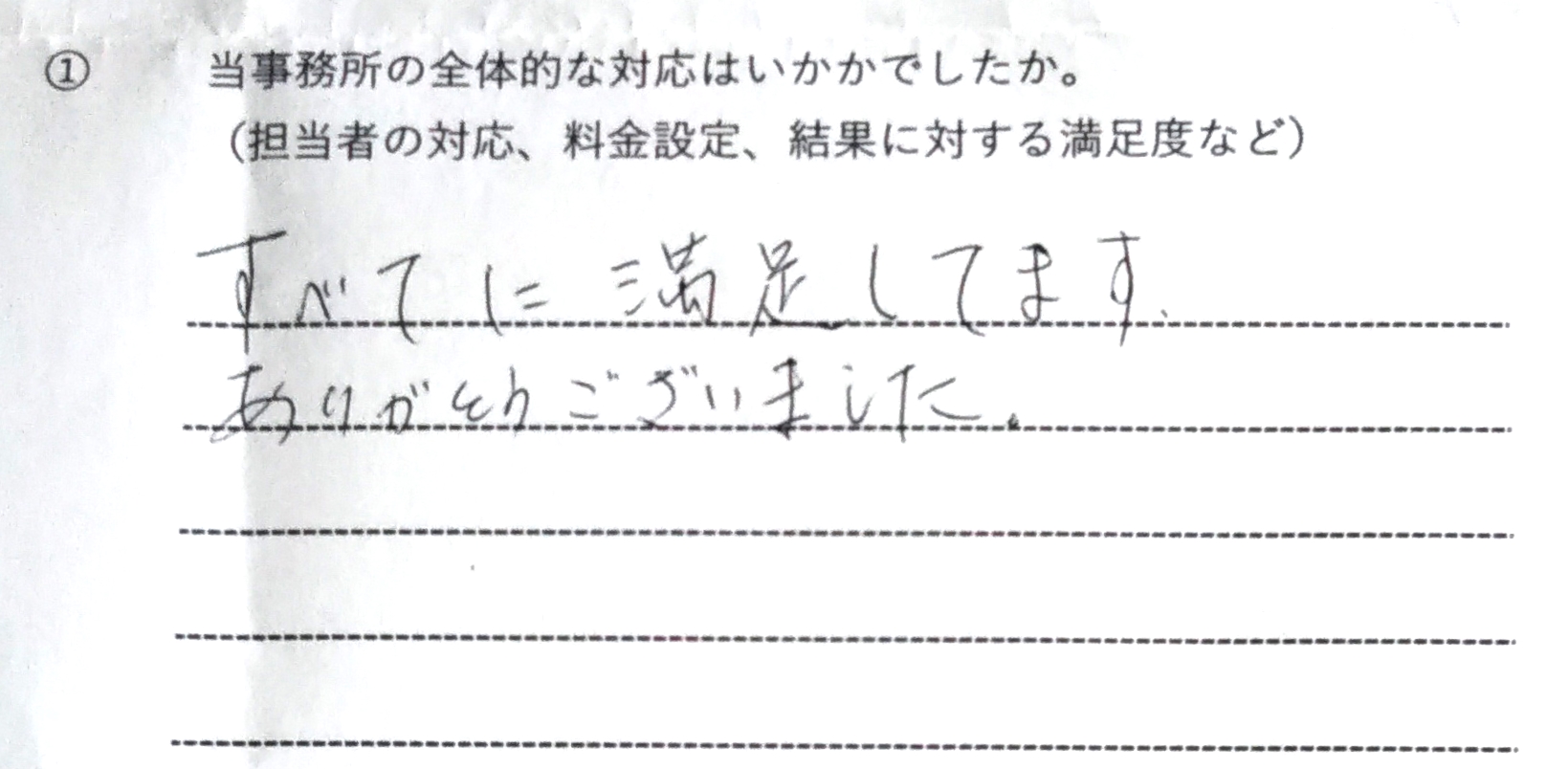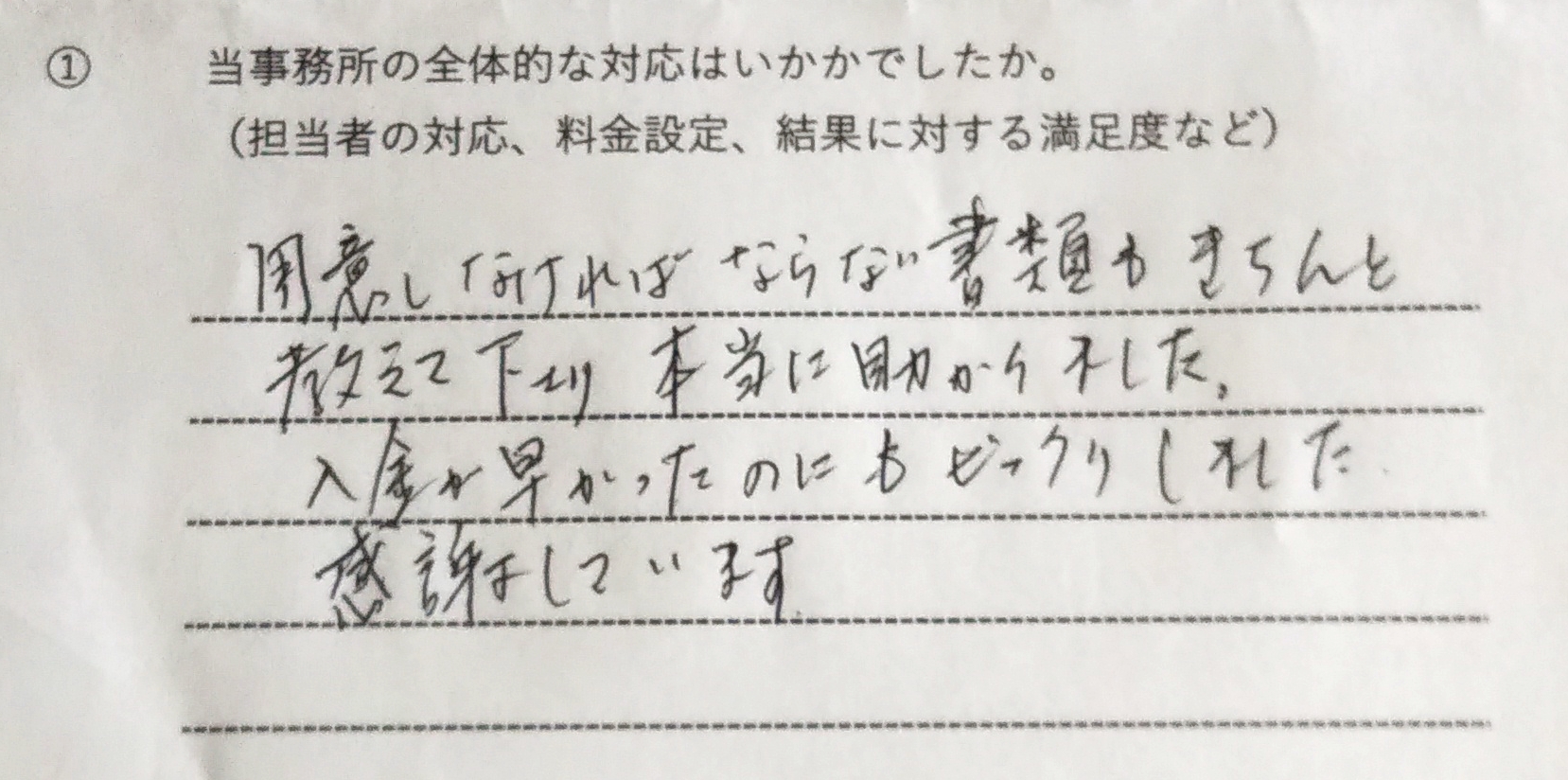 ご満足いただけたことは当事務所としても喜ばしい限りです。必要書類の準備にもご協力いただき、ありがとうございました。