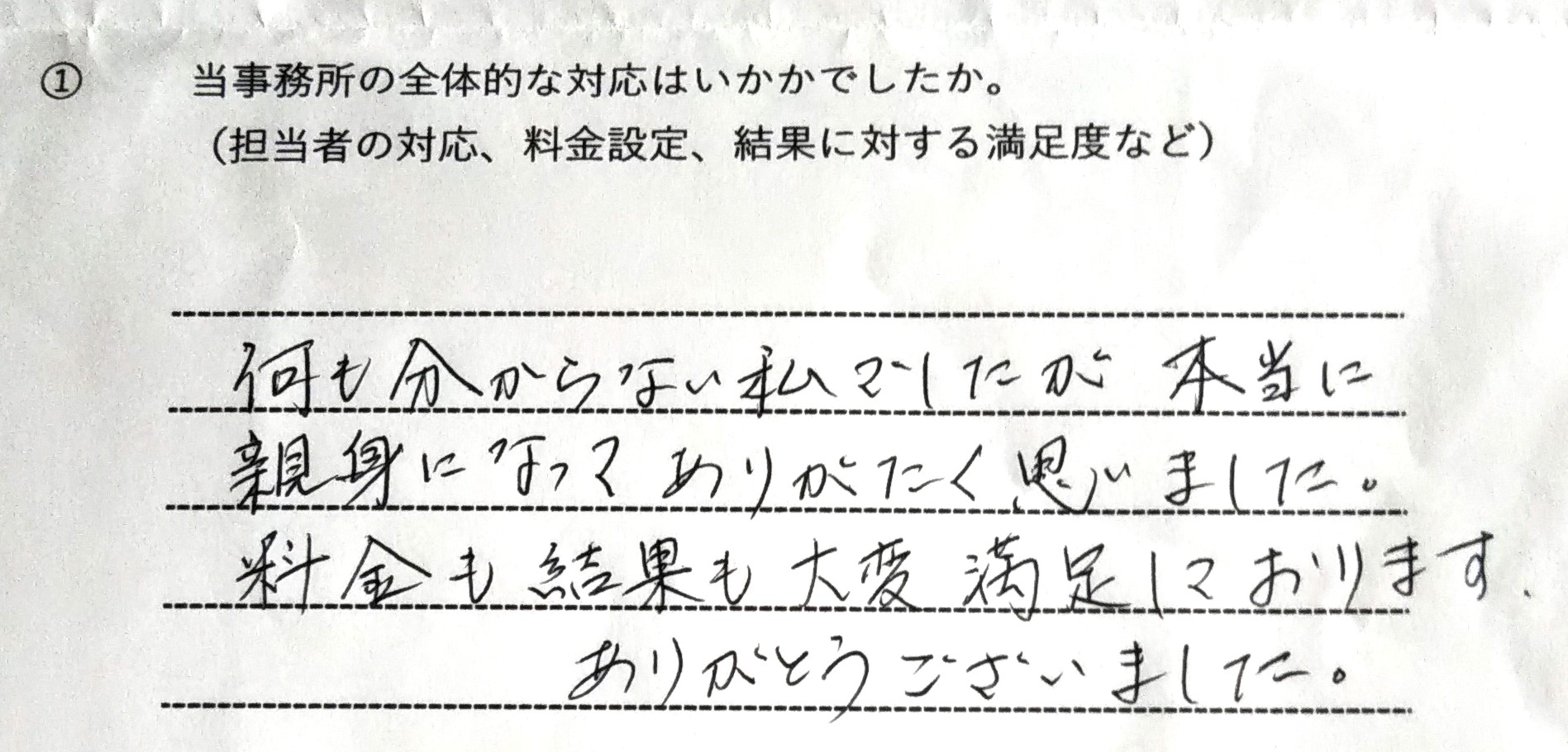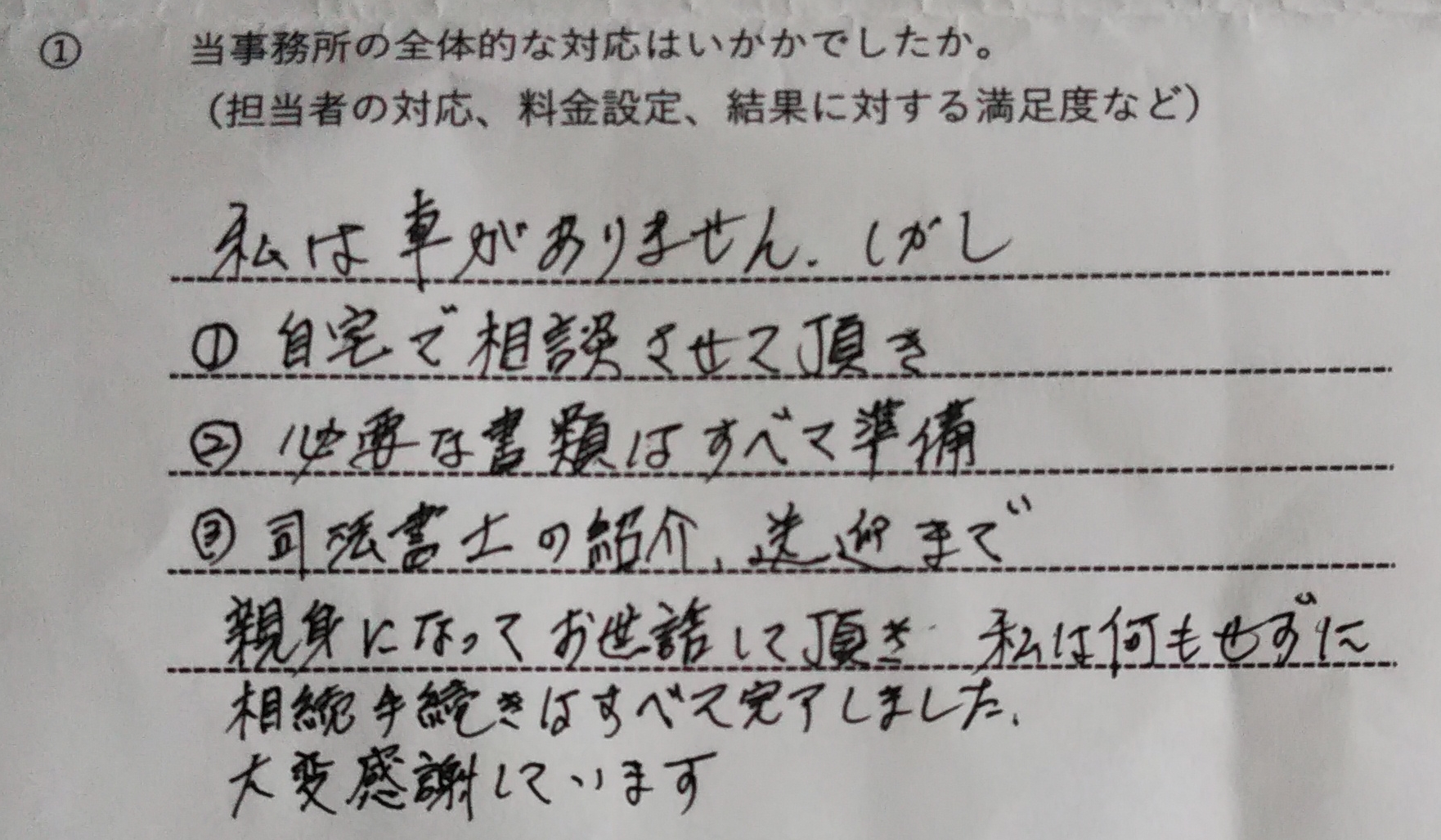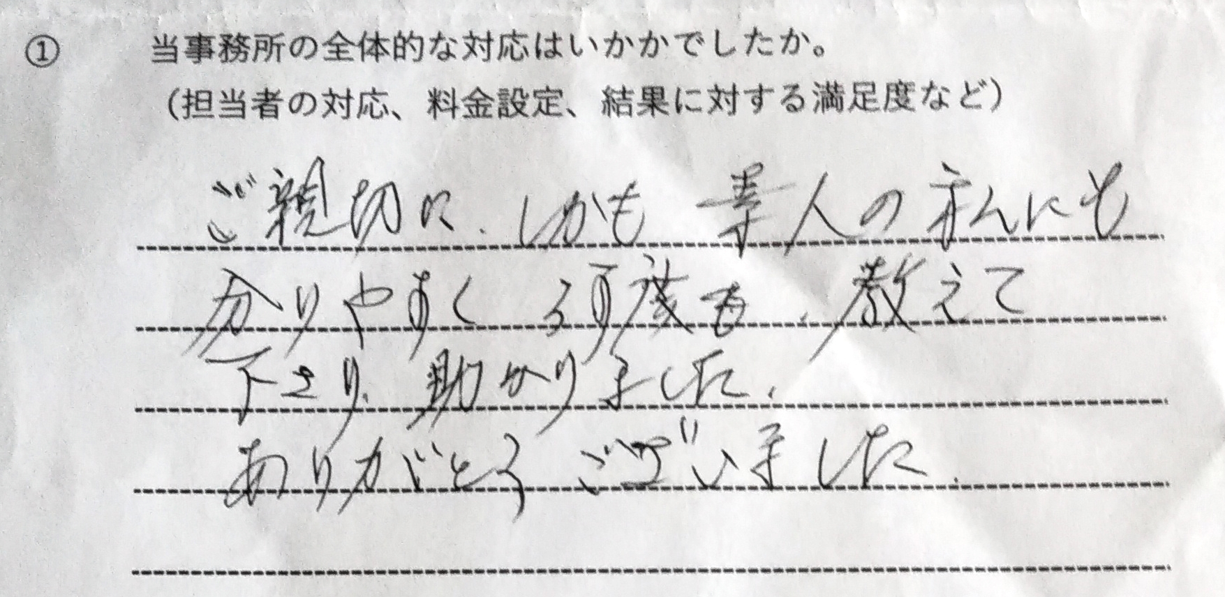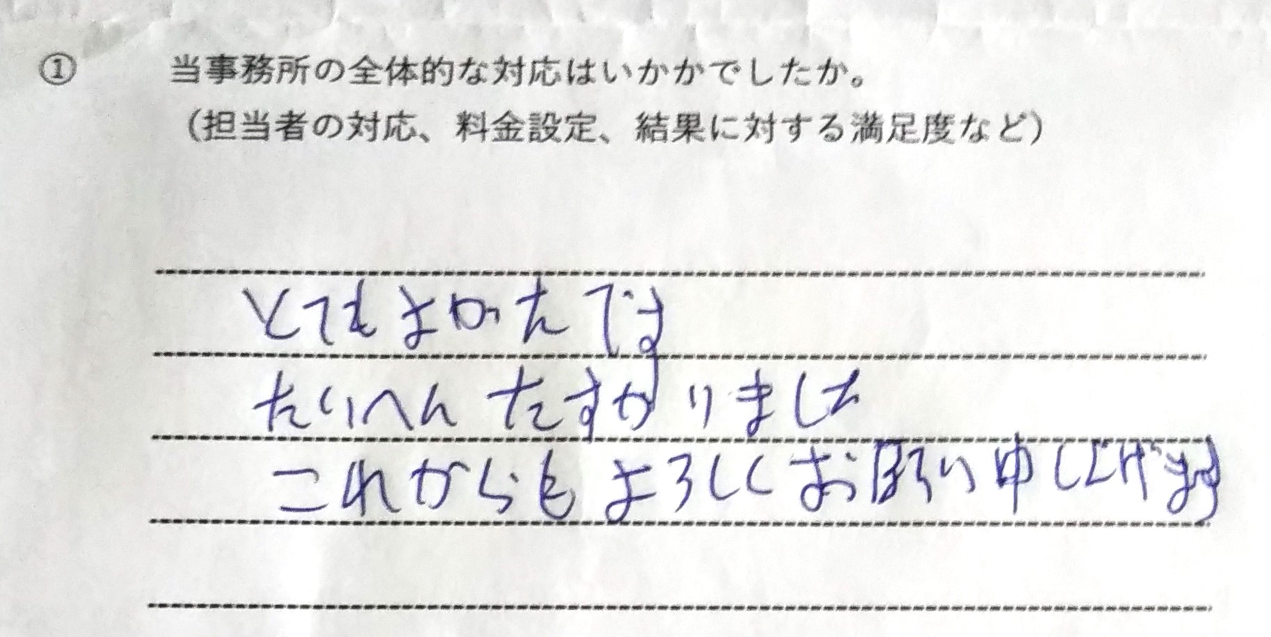 この度は当事務所にご依頼いただきまして本当にありがとうございました。当方からお願いした書類もきちんと揃えられており、おかげで手続が大変スムーズに進みました。