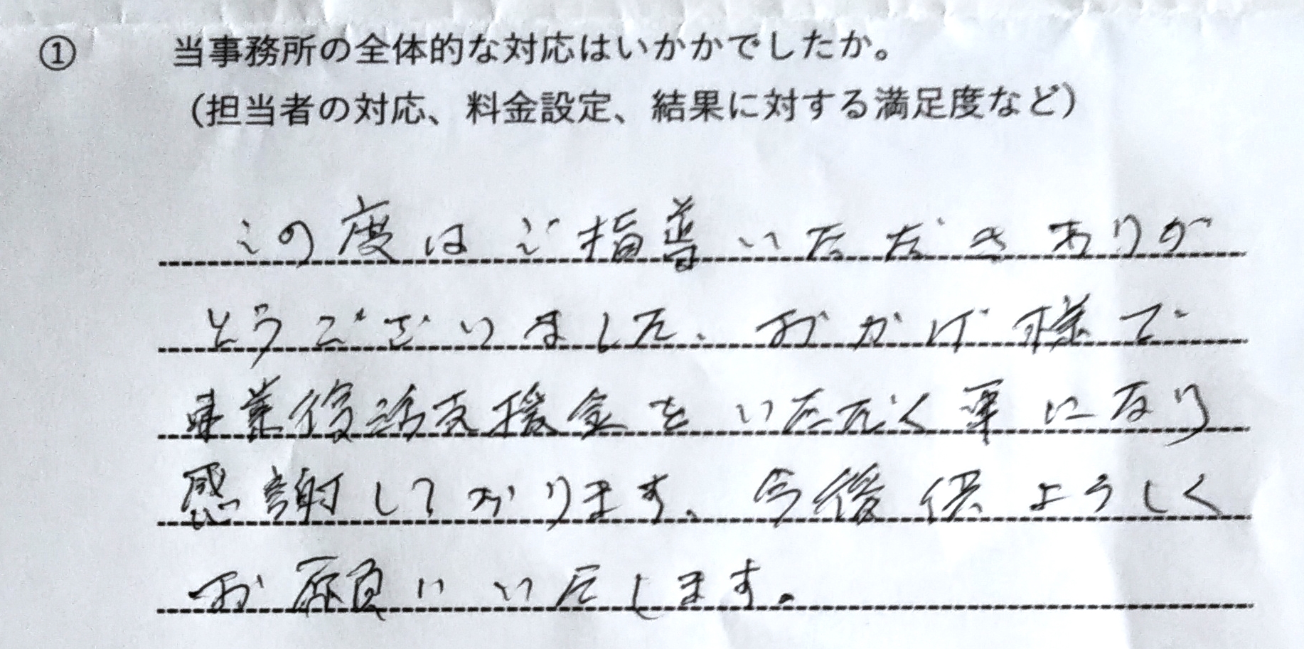 当事務所にご依頼いただきまして誠にありがとうございました。必要書類については事前に確認のお電話をいただいておりましたので、申請はスムーズに進めることが出来ました。