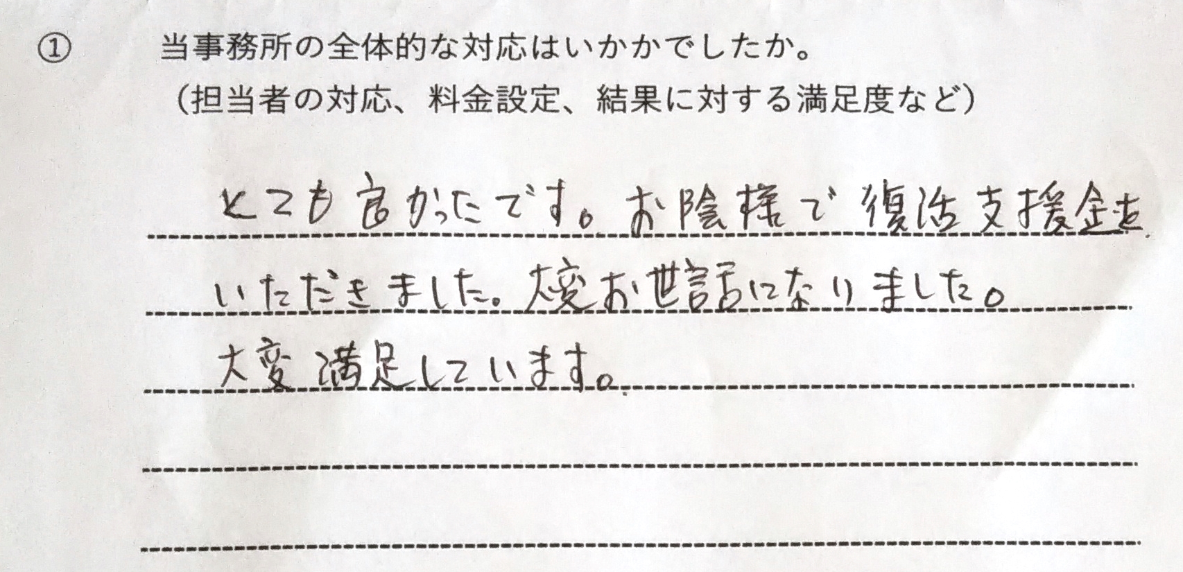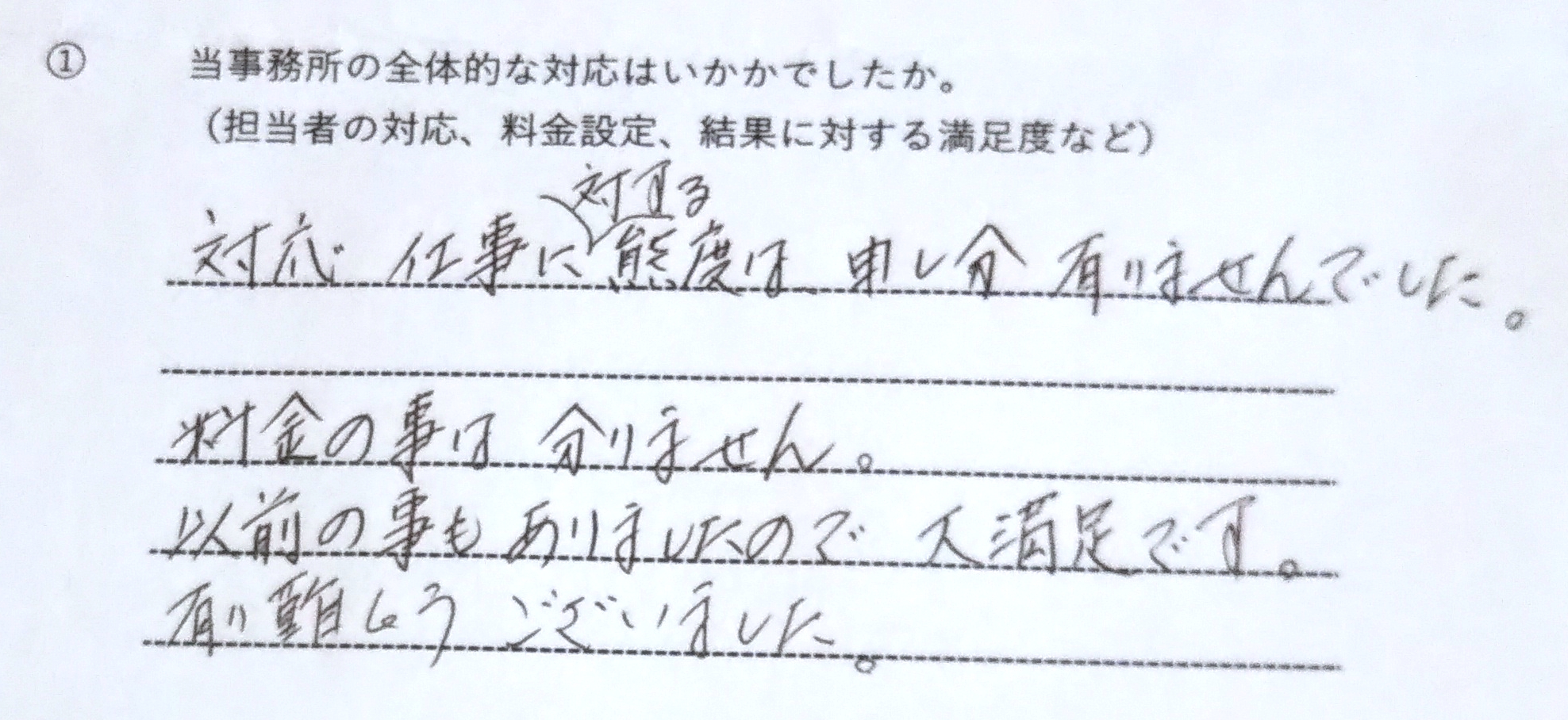 ご満足いただけたことは当事務所としても喜ばしい限りです。必要書類の準備にもご協力いただき、ありがとうございました。