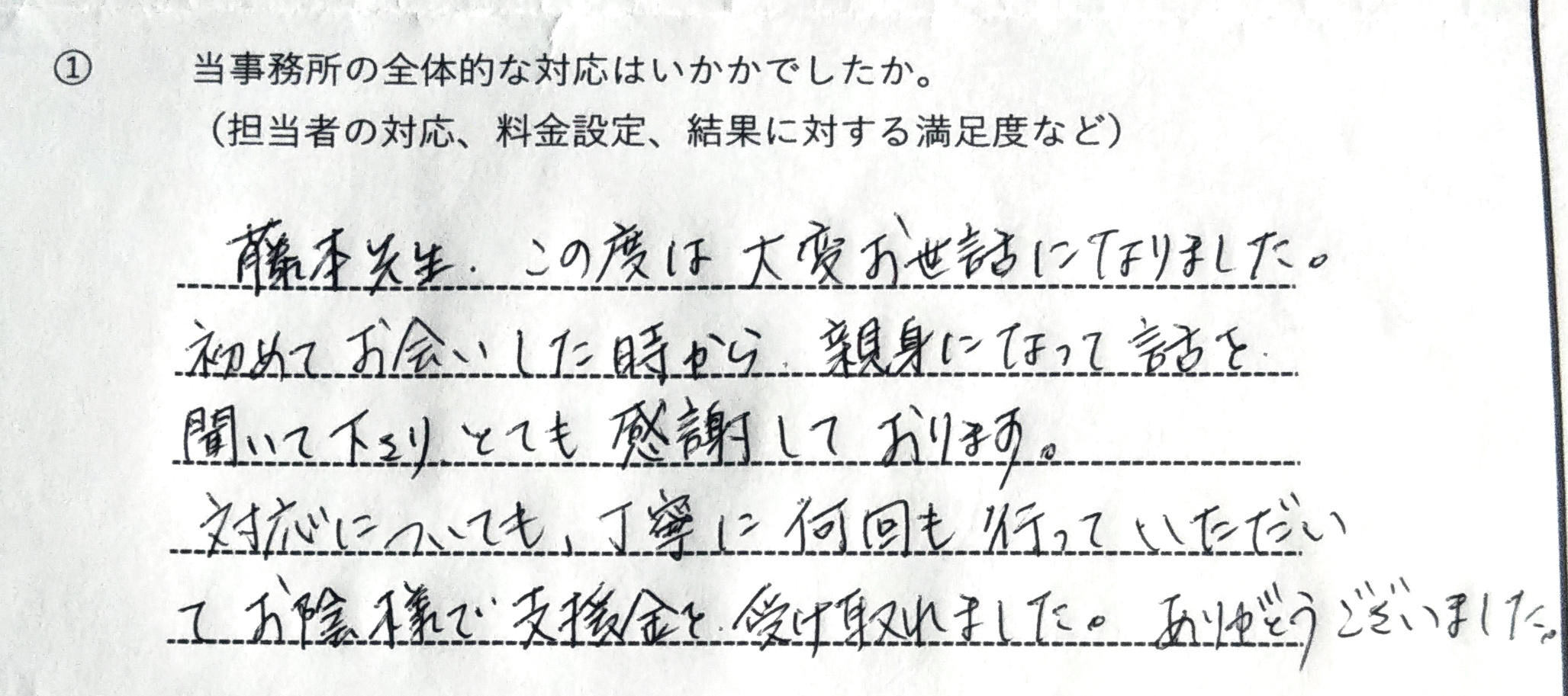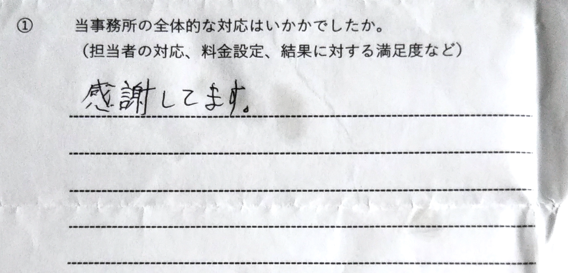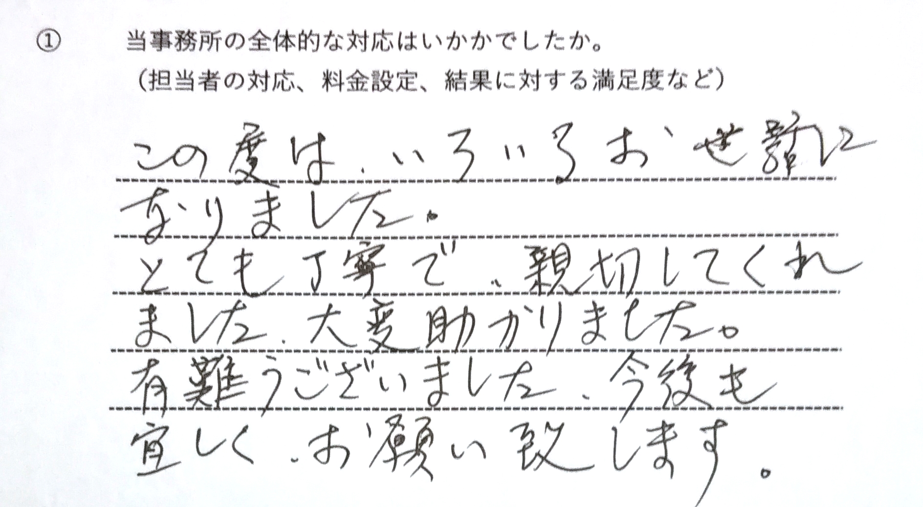 ご依頼者様の現状を確認し、なんとかご要望をかなえたいと思い取り組みました。そのための必要書類の準備にもご協力いただきまして本当に助かりました。