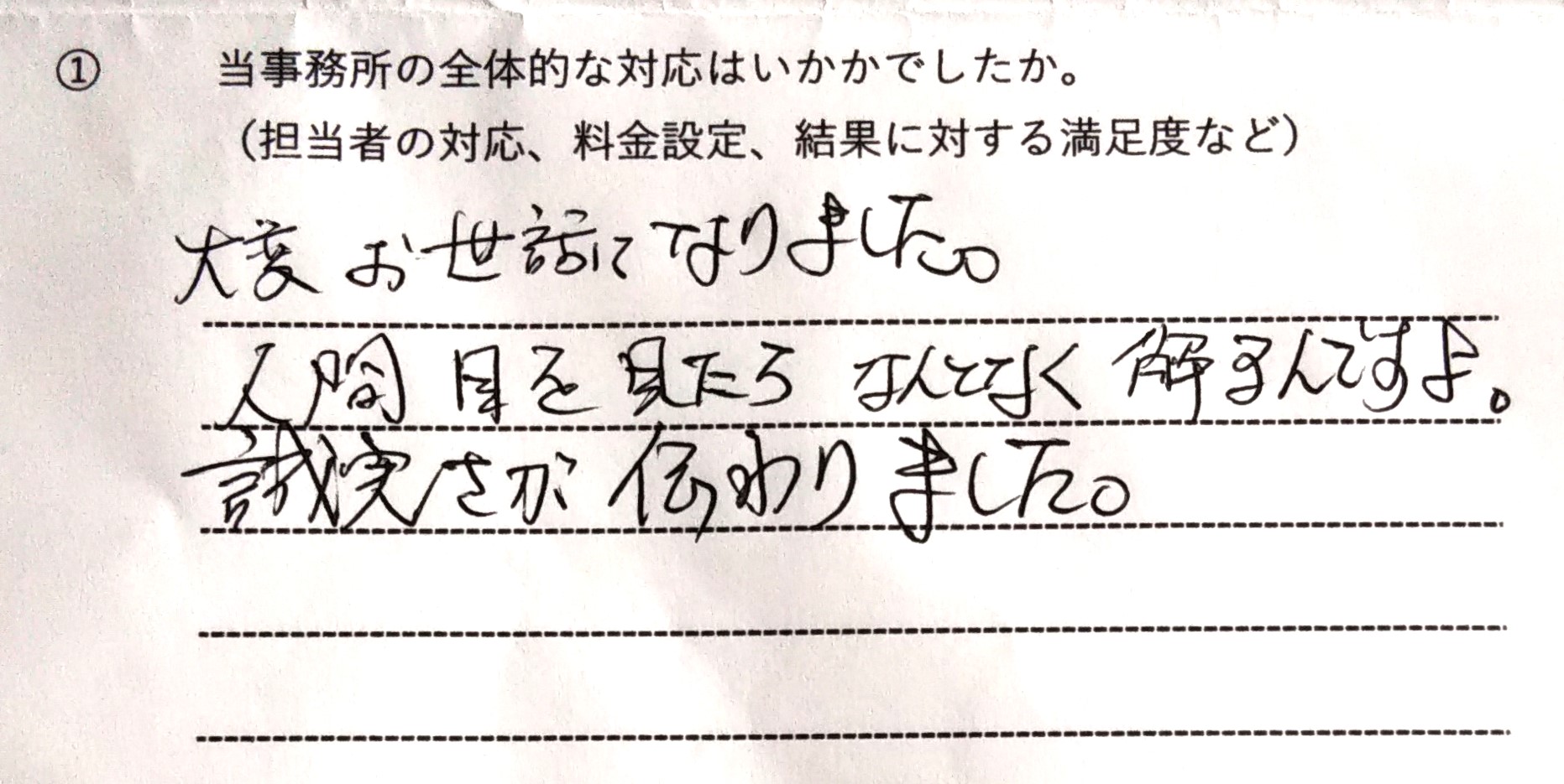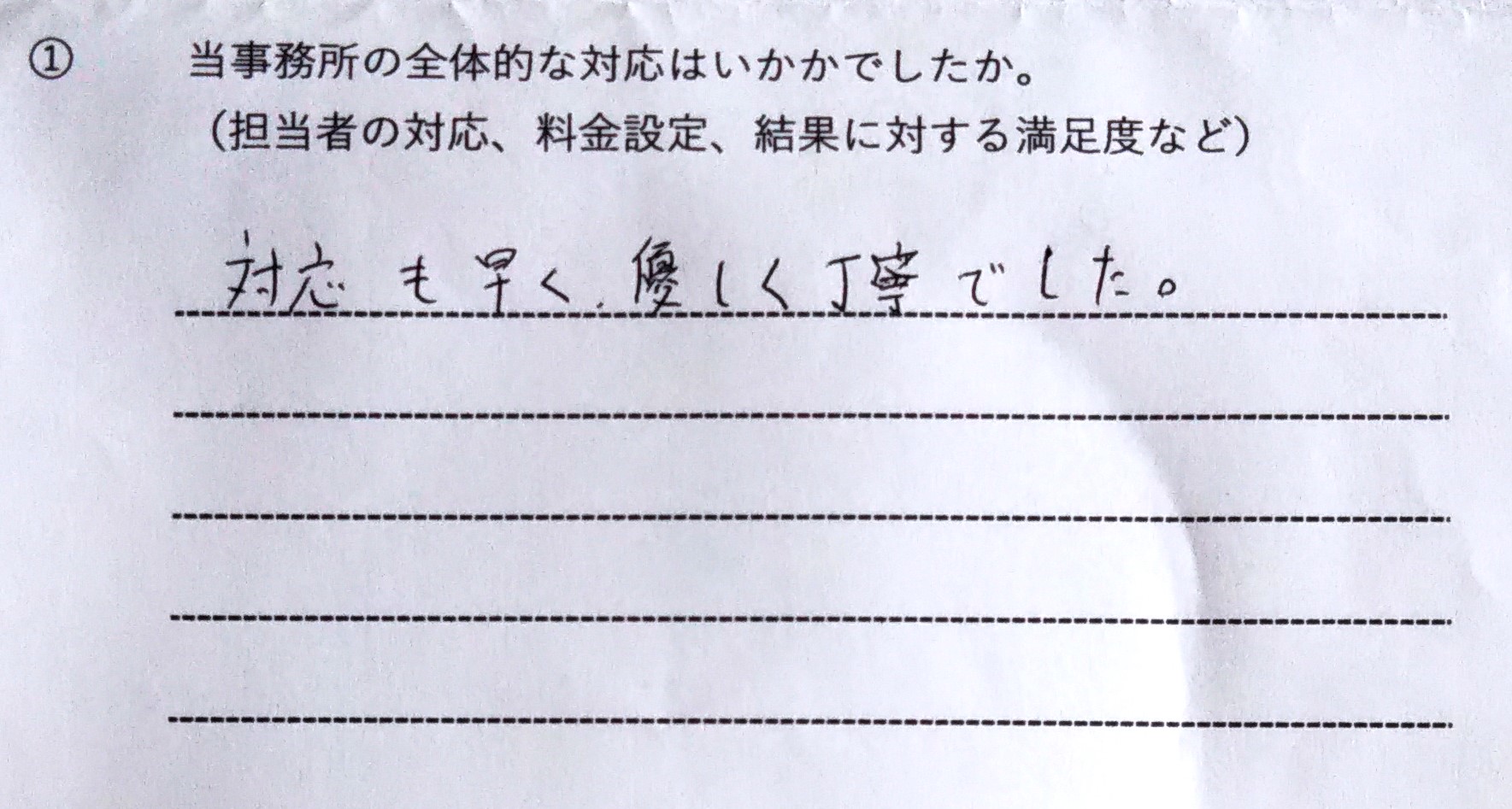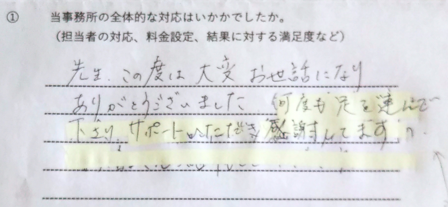 この度は当事務所にご依頼いただきまして本当にありがとうございました。当方からお願いした書類もきちんと揃えられており、おかげで手続が大変スムーズに進みました。