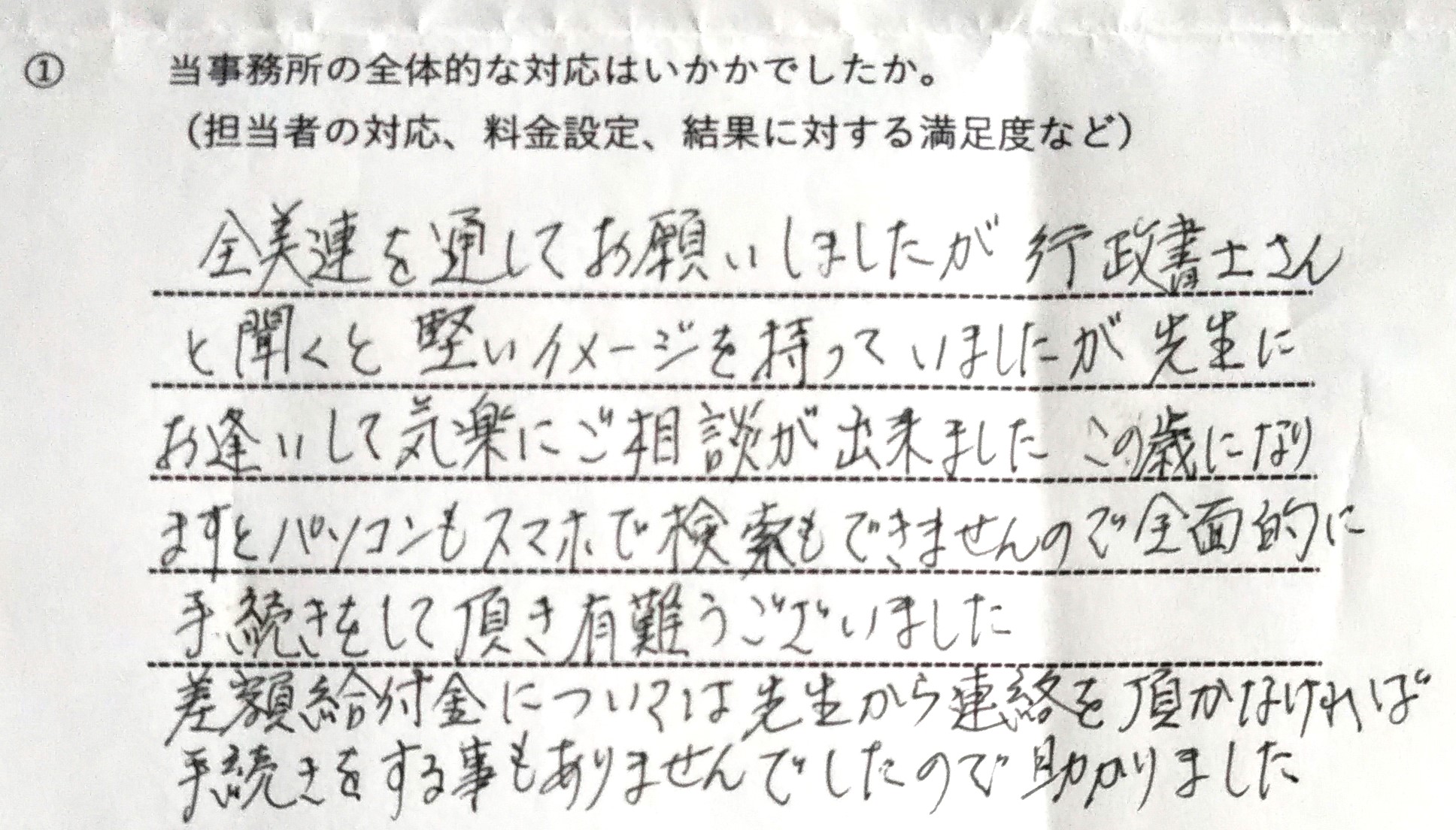当事務所にご依頼いただきまして誠にありがとうございました。必要書類については事前に確認のお電話をいただいておりましたので、申請はスムーズに進めることが出来ました。